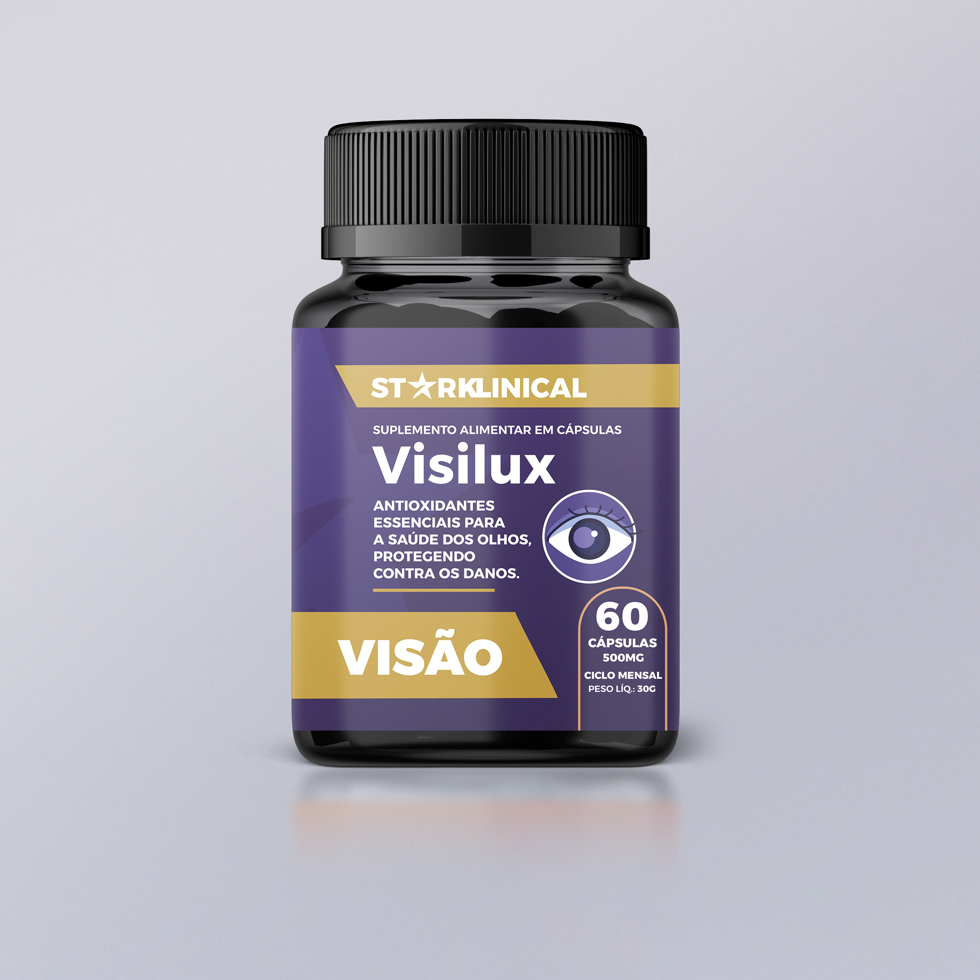 Suplemento com antioxidantes e nutrientes para suporte à saúde ocular, com luteína, zeaxantina, zinco e vitaminas.